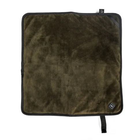 • z jednej strony miękki, gruby welurowy materiał w oliwkowym kolorze