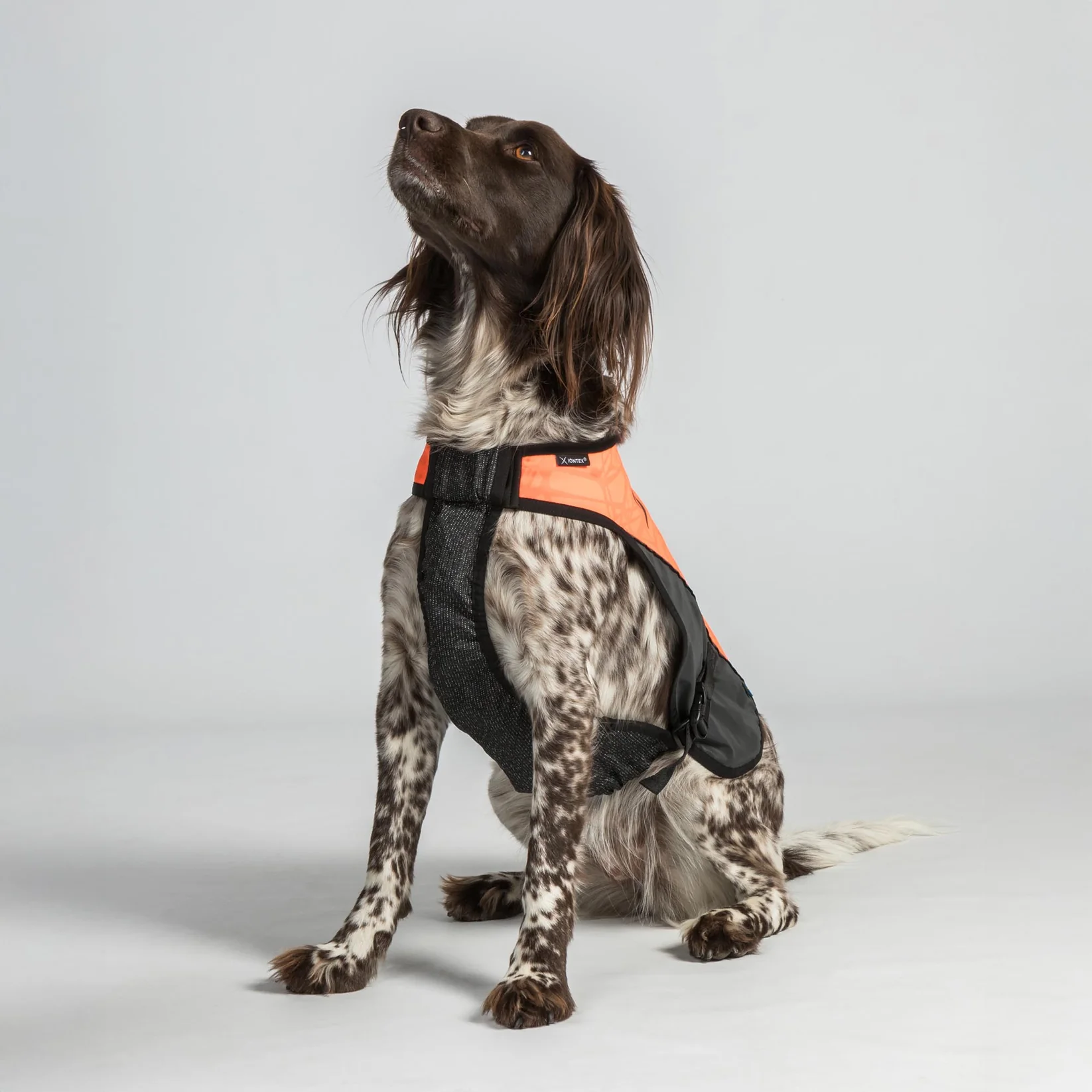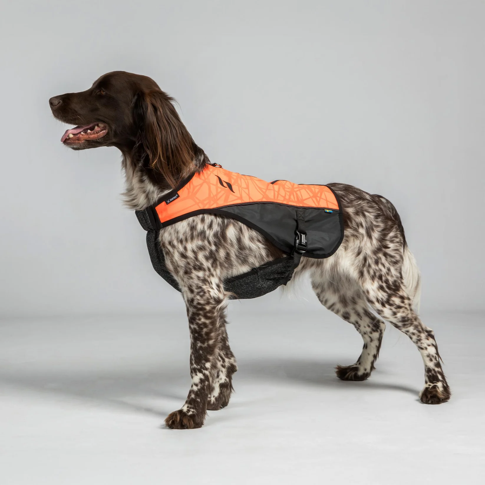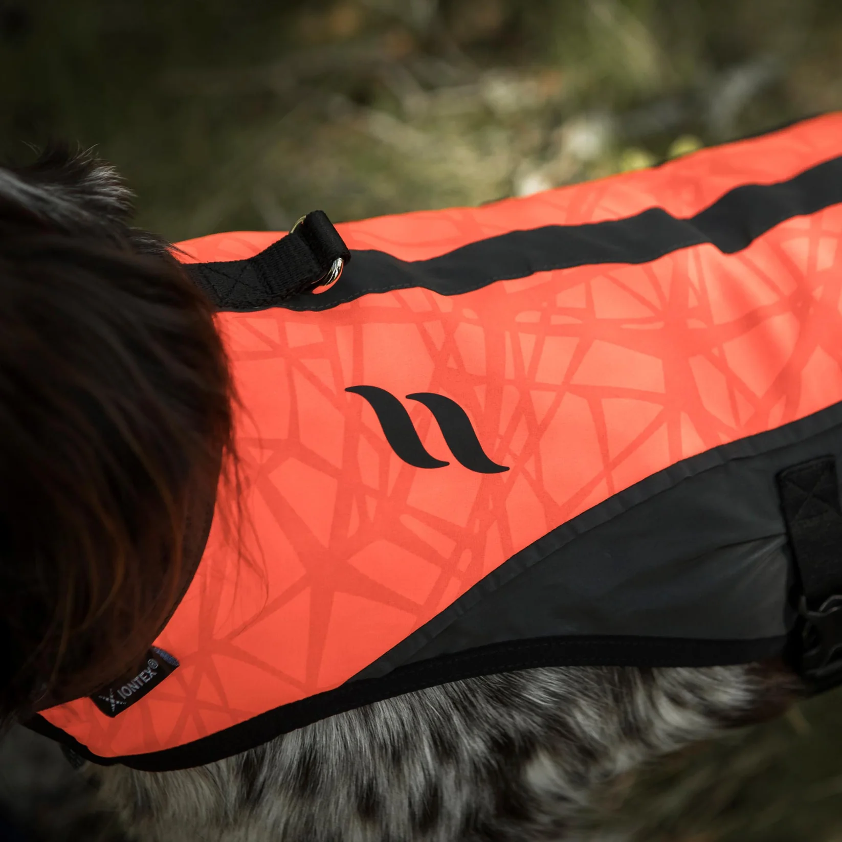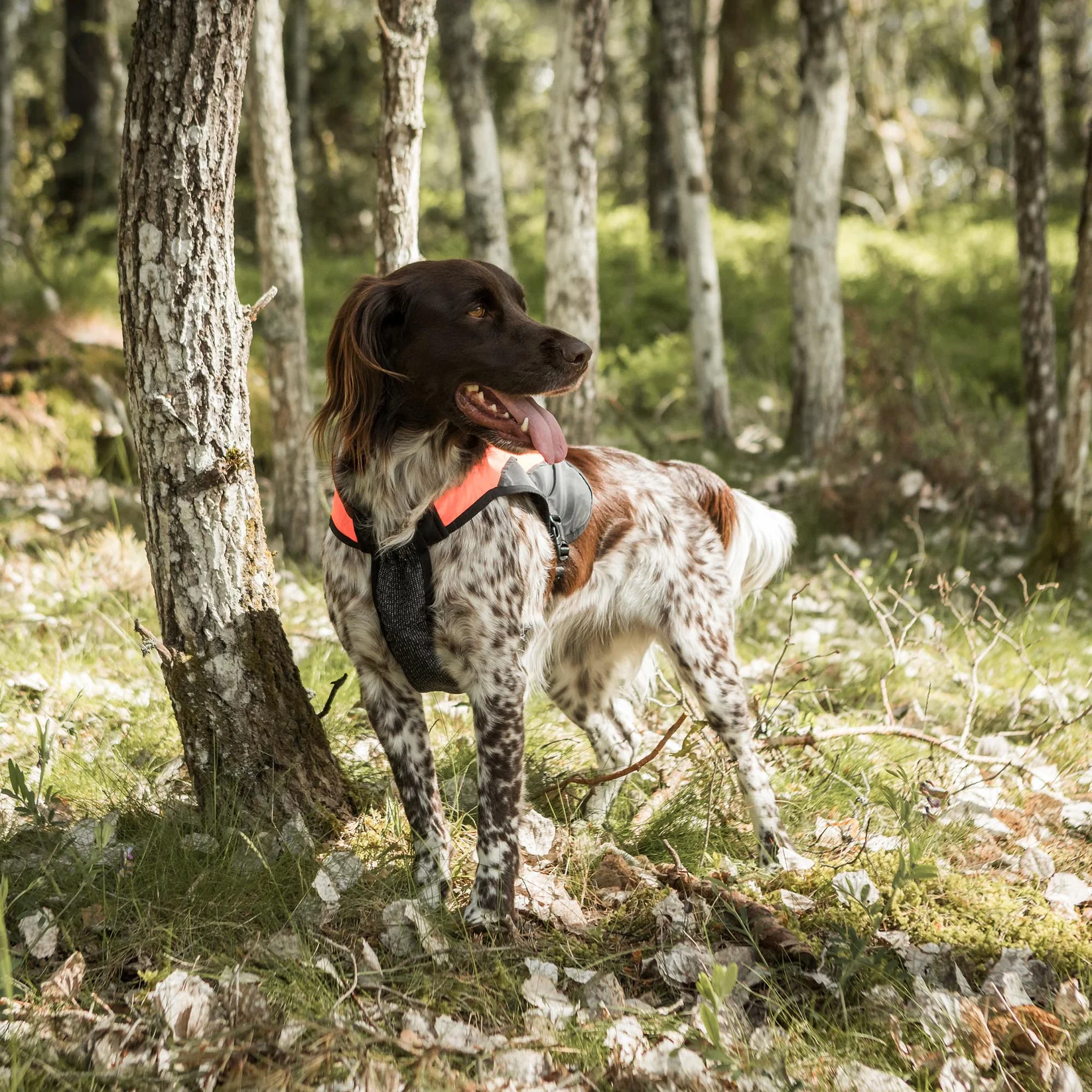 Czarny wzór na kamizelce wskazuje na kierunek i pozycję psa, co jest zwłaszcza przydatne podczas polowania.