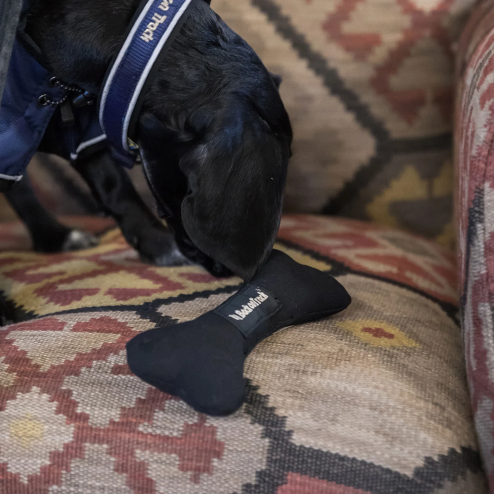 Przyjemna, miękka kość dla psa do gryzienia, noszenia i aportowania. Z jednej strony naszyta naszywka z logo marki. dostępna w rozmiarze 19 i 25 cm.