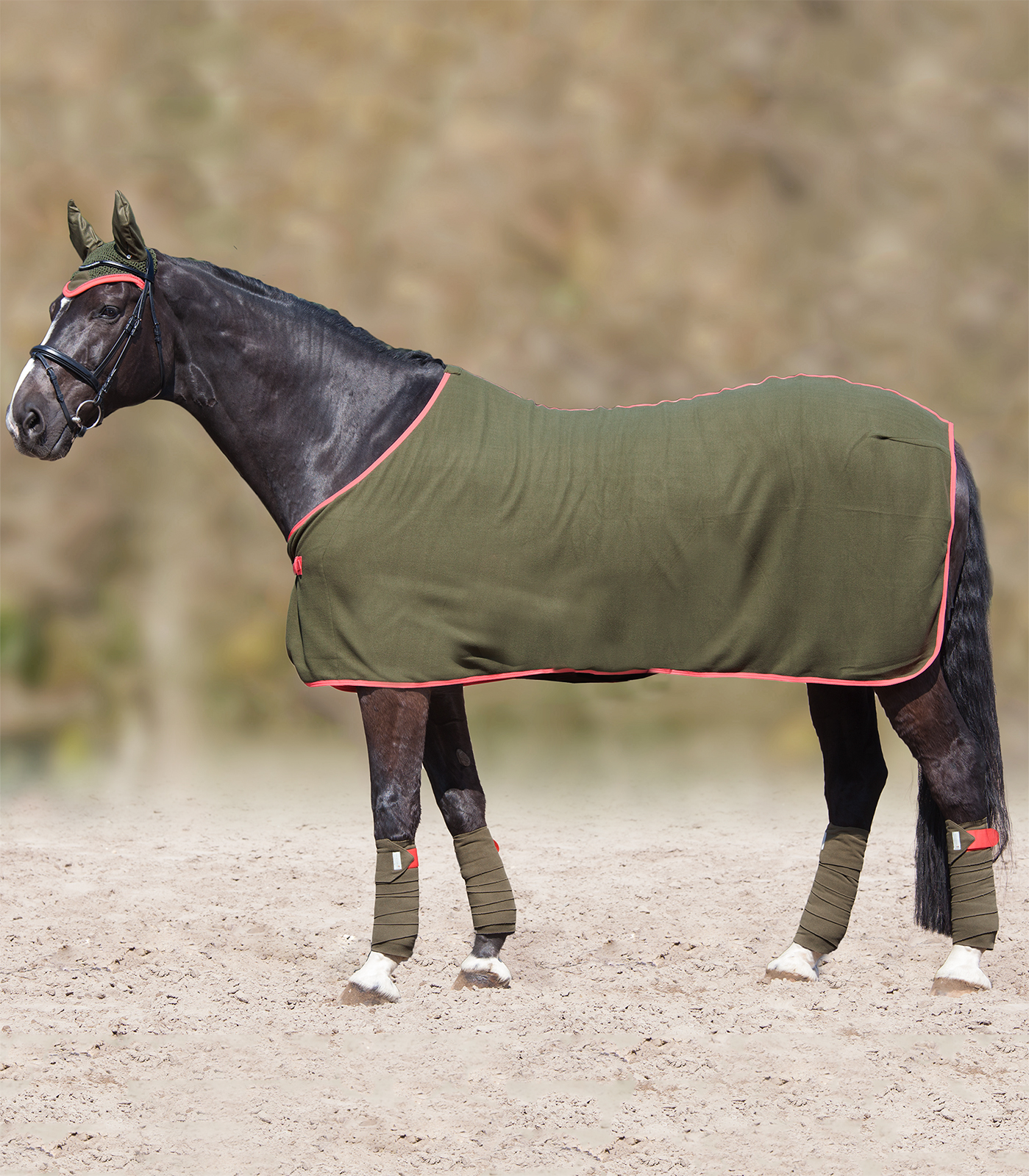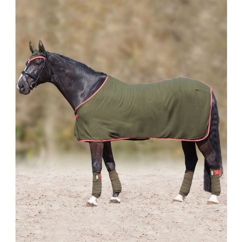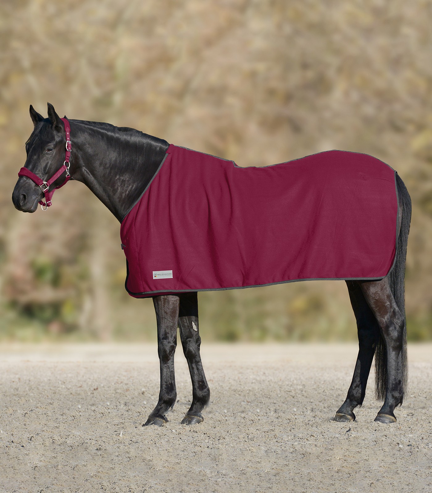 Derka polarowa bez pasów krzyżowych. Dzięki specjalnym właściwościom do odprowadzania wilgoci na zewnątrz, derka sprawdza się idealnie po treningu do osuszenia konia.
