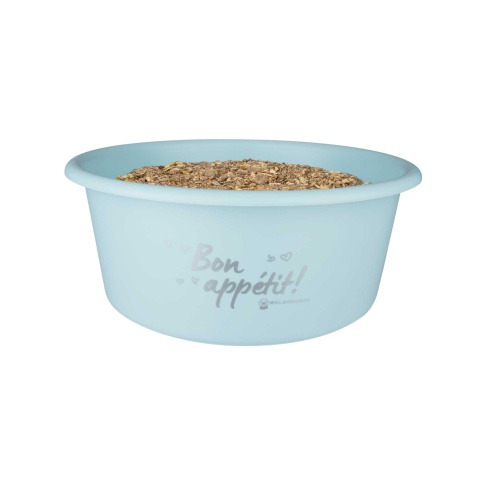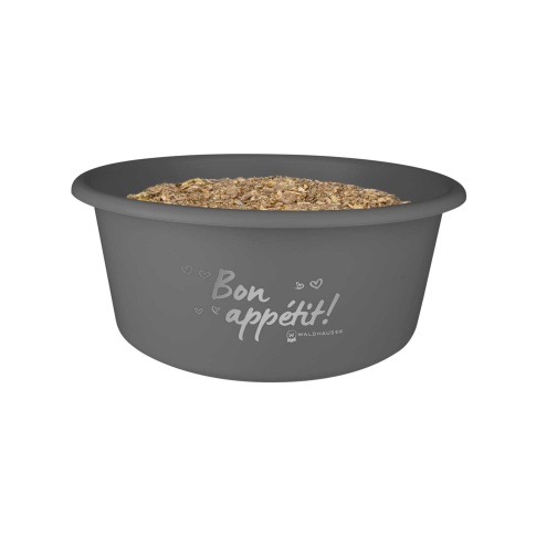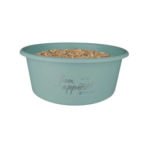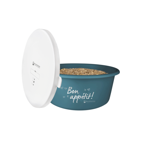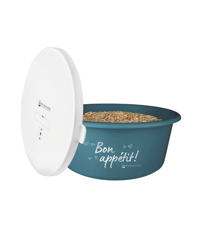Wysokiej jakości pojemnik na musli wykonany z wytrzymałego tworzywa przeznaczonego do kontaktu z żywnością.  Pojemnik w kształcie okrągłej miski z przykrywką. Zamknięcie jest wykonane z elastycznego tworzywa, które nie sztywnieje w niskich temperaturach, łatwo więc można pojemnik zamknąć i otworzyć. Dzięki zamknięciu można chronić żywność dla konia przed gryzoniami i działaniem światła.